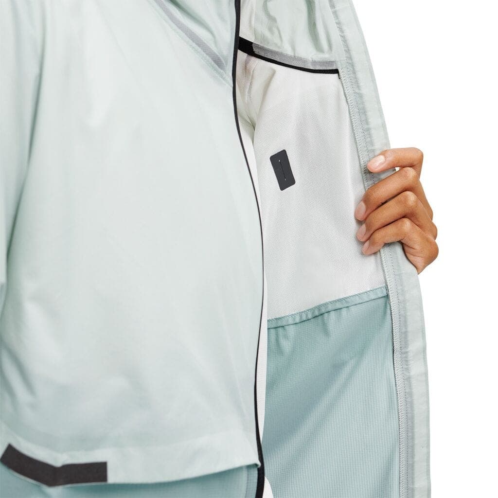 Every element of the Weather Jacket is made with the practicalities of running in the elements in mind. Like, the cap design of the jacket's hood, which keeps it in place in the wet. The pockets of the Weather jacket offer water-resistant zip protection for your valuables. And the entire jacket folds quickly into its own breast pocket, allowing for ultra-small storage and portability.